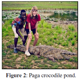 The Upper East Region (UER) of northern Ghana is noted for its diverse cultures and history and the communal spirit among its indigenes. It contributes the second smallest land mass among the currently 16 administrative regions of the country. Popular tourist sites in UER include the Paga Crocodile Pond, Navrongo Cathedral, Bolgatanga art and craft market, Tongu hills and Tenzug shrines. The crocodiles live in the Paga Crocodile Pond, about forty-four kilometers from Bolgatanga, the regional capital, where they swim merrily along side young children while their mothers wash clothes on the banks. The people of Paga claim that, no one has ever been harmed by any of the crocodiles. The crocodiles are equally respected by the citizens who believe that the soul of every native of Paga is carried by these animals (Patoway, 2015). Besides, whenever any important personality in the village dies, it is followed by the death of one of the sacred crocodiles because it is believed that the crocodiles are somehow connected to their ancestral spirits. By this perception, the crocodiles are therefore, well protected and regarded as being sacred in the community. The indigenes of Paga ensure the crocodiles are fed by offering them sacrifices of live fowls. Scientifically, crocodiles are carnivorous and generally aggressive, but not in the town of Paga. Through natural acquaintances to adaptive animal behavior, the crocodiles have in turn learned to live harmoniously with the people. This phenomenally unusual friendship between the people of paga and the crocodiles does not however render the reptiles as being naturally totally harmless, particularly if threatened or endangered by externalities (Bateman and Fleming, 2012).