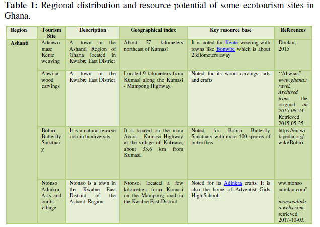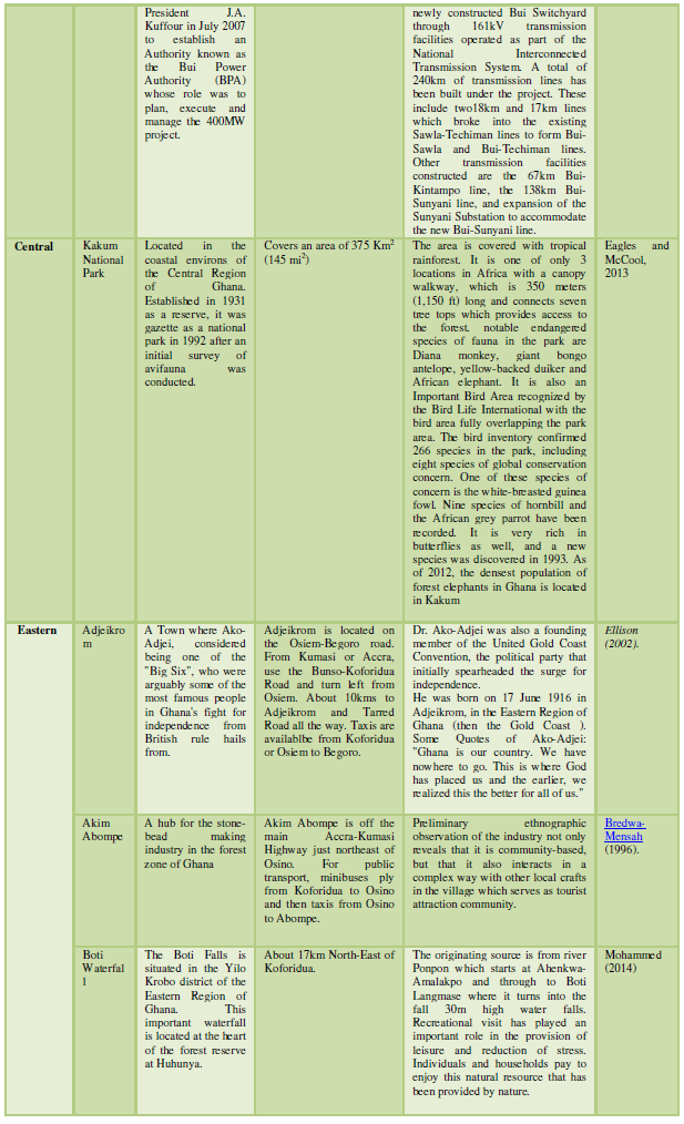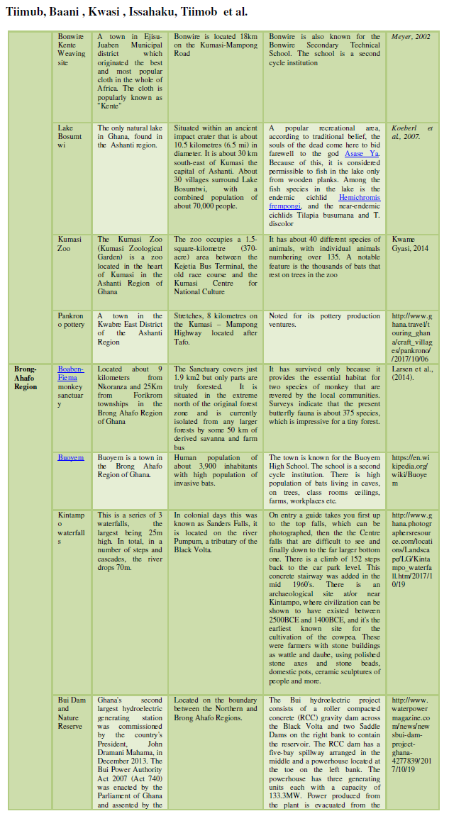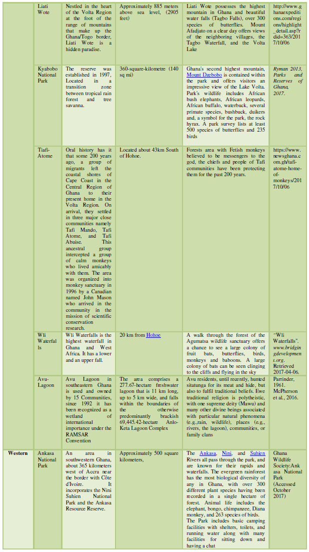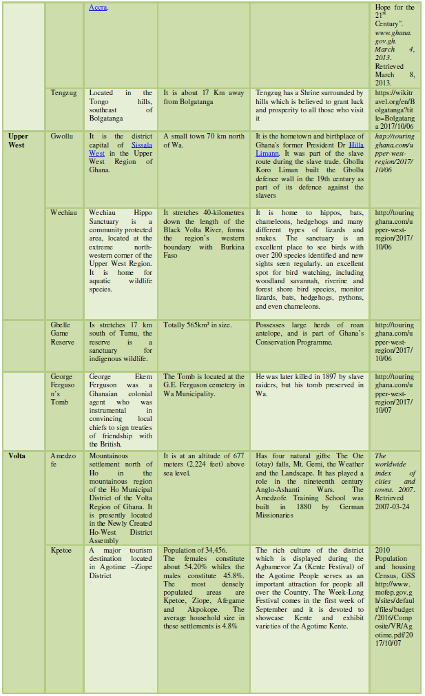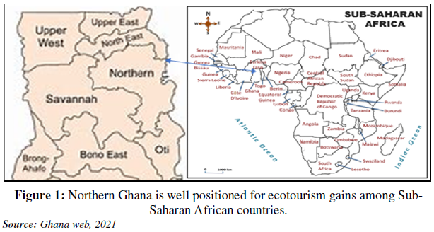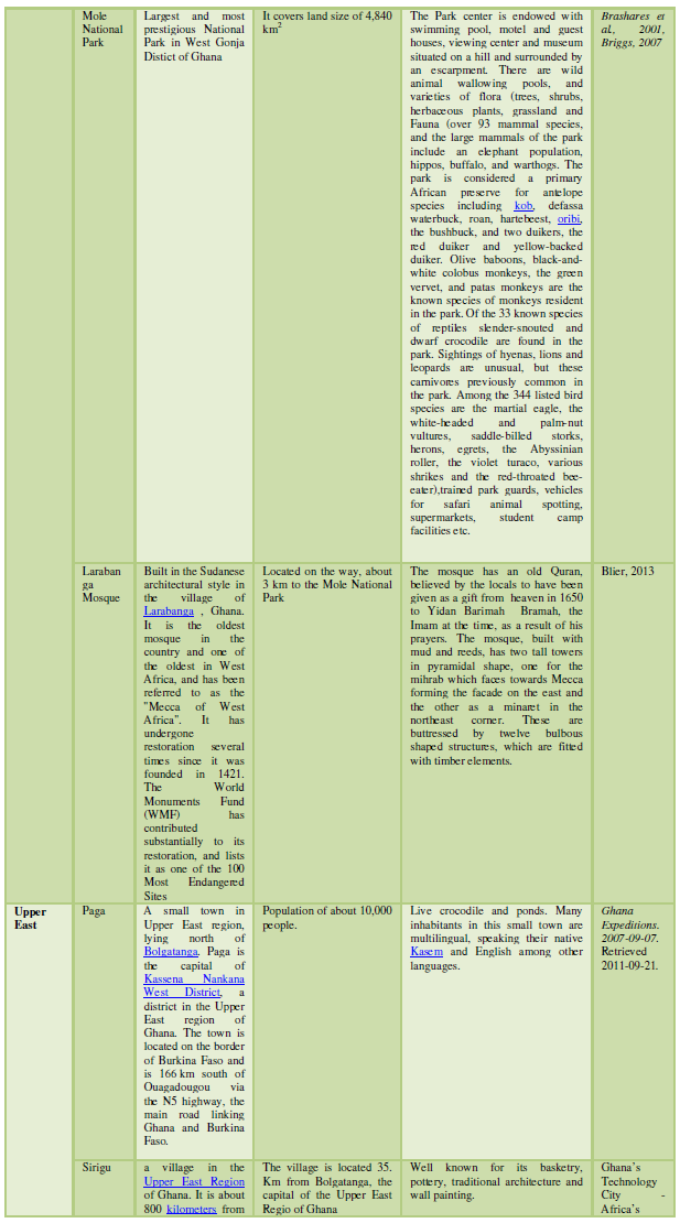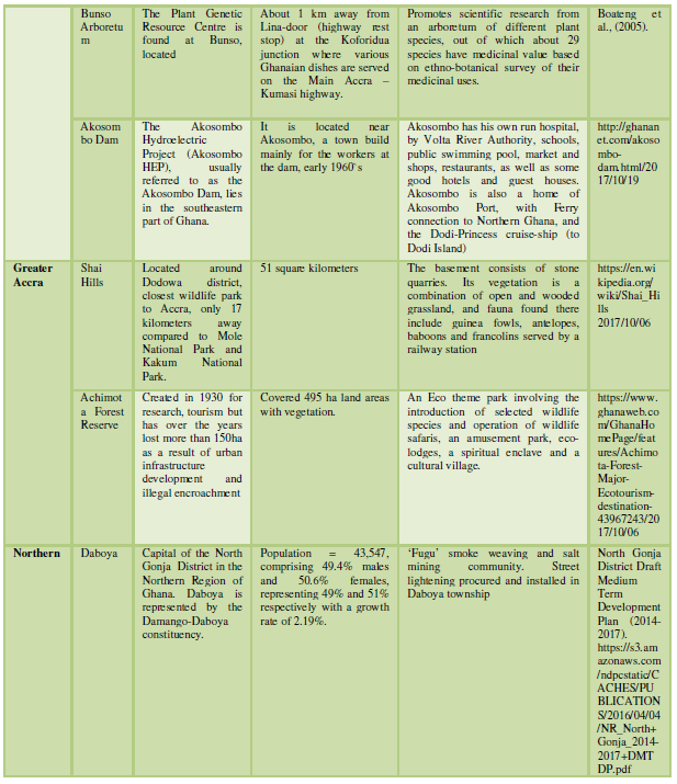 A holistic evaluation of the key tourism sites by introspection of their resource potential within the ecotourism value chain was cross-examined based on revised literature accessed. And a descriptive information with some photographs were taken from the seven regions comprising northern Ghana in the scope of this current mini reviews (Figure 1). Appendix (Table 1) abducted from our previous studies). Aspects of the unique features, benefits, management and maintenance of sacred grove, as well as considerations on effective networking to address challenges and harness tourism sector gains have been summarily discussed.