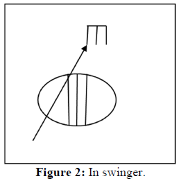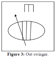 Aligning the seam slightly to the right and placing the roughened side of the ball on the right makes the ball swing in towards a batsmen and this is called Inswinger. For e.g. An inswinger to a right-handed batsman can be bowled by holding the seam slightly to the right towards fine leg and placing the roughened side of the ball on the right. The role of the wrist plays important role, i.e., a bowler should flip his wrist towards leg slip and this results in the ball moving in towards his body (Figure 2).