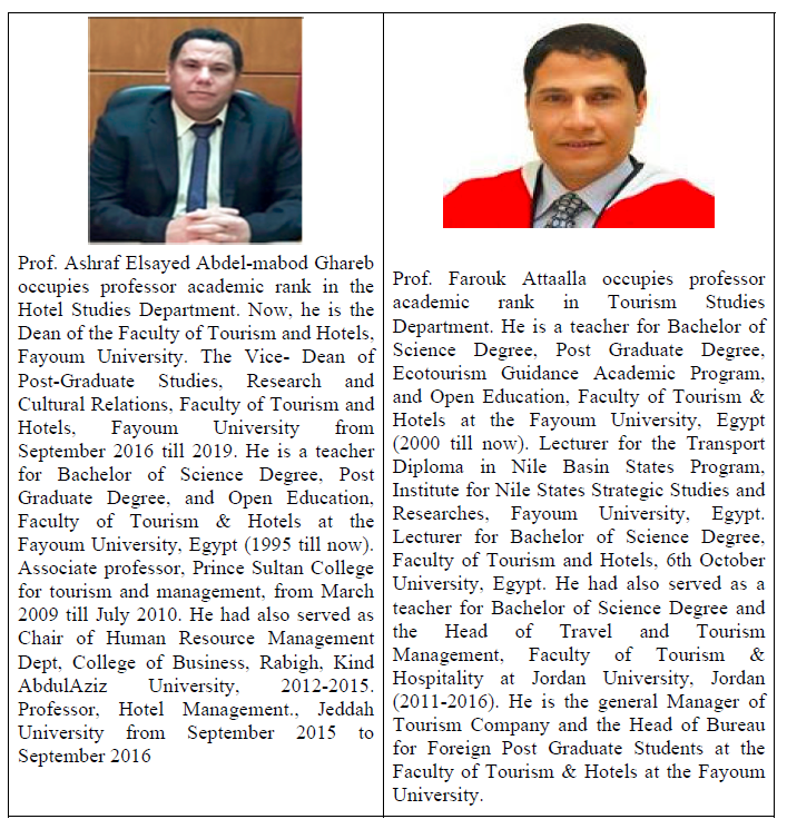 (Department of Education and Student Affairs, Faculty of Tourism and Hotls, Fayoum University, 2016-2017; Department of Education and Student Affairs, Faculty of Tourism and Hotls, Fayoum University, 2017-2018; Department of Education and Students Affairs, Faculty of Tourism and Hotels, Fayoum University, 2018-2019; Department of Education and Student Affairs, Faculty of Tourism and Hotels, Fayoum University, 2019-2020; Public Service Center, Faculty of Tourism and Hotels, Fayoum University, 2016-2017; Public Service Center, Faculty of Tourism and Hotels, Fayoum University, 2017-2018; Public Service Center, Faculty of Tourism and Hotels, Fayoum University, 2018-2019; Public Service Center, Faculty of Tourism and Hotels, Fayoum University, 2019-2020).