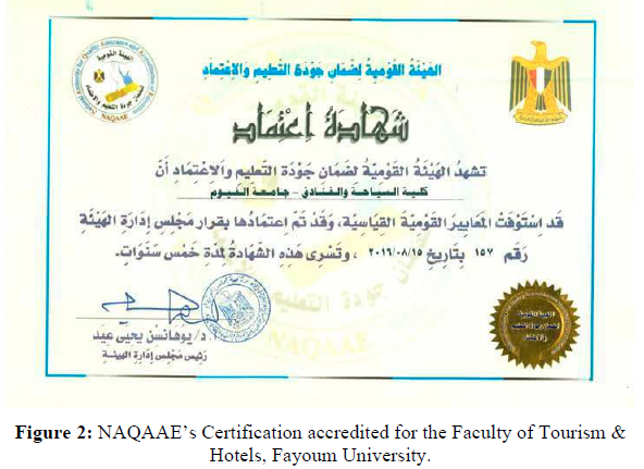 Moreover, the unit seeks to gain the community's confidence in the faculty's graduates to achieve competitive advantage locally and regionally. As from August 2016, Faculty of Tourism and Hotels at Fayoum University has been accredited by the National Authority for Quality Assurance and Accreditation of Education (NAQAAE), and has become the first endorsed faculty of tourism education in Egypt (Figure 2).