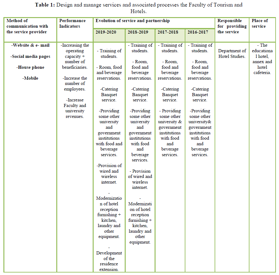 This criterion includes the capabilities of excellence for the Hotel Studies Department Faculty of Tourism and Hotels-Fayoum University in the teaching process, training services, consultations, community service and the environment individually or jointly within the framework of the axes of Egypt 2030 vision, through human staff with international and local expertise, and the design, provision and development of services with added value in an innovative way in comparison with the similar colleges, such as accommodation, food and beverage services. This leads to achieve the satisfaction and positivity of the beneficiaries and improves the results of the institutional performance of the faculty, based on the system of evaluating the results of performance indicators for the services provided through beneficiary surveys about the services provided. This is clear illustrated in the Table 1.