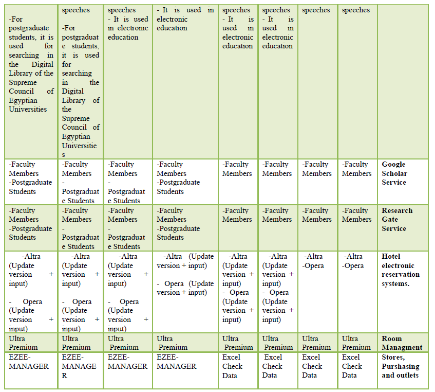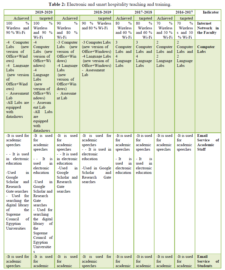 This standard includes the excellence capabilities of the Hotel Studies Department of the Faculty of Tourism and Hotels - Fayoum University in the use of information technology and digital solutions for smart government. In order to guarantee an added value in an innovative way according to local and international standard performance indicators, and based on the evaluation of the results of the performance indicators of electronic transformation and smart government, including those related to the advanced electronic infrastructure in the faculty, the flow of information and information security in the faculty, and the presence of the faculty on the Internet and social networks. More details in the Table 2.
