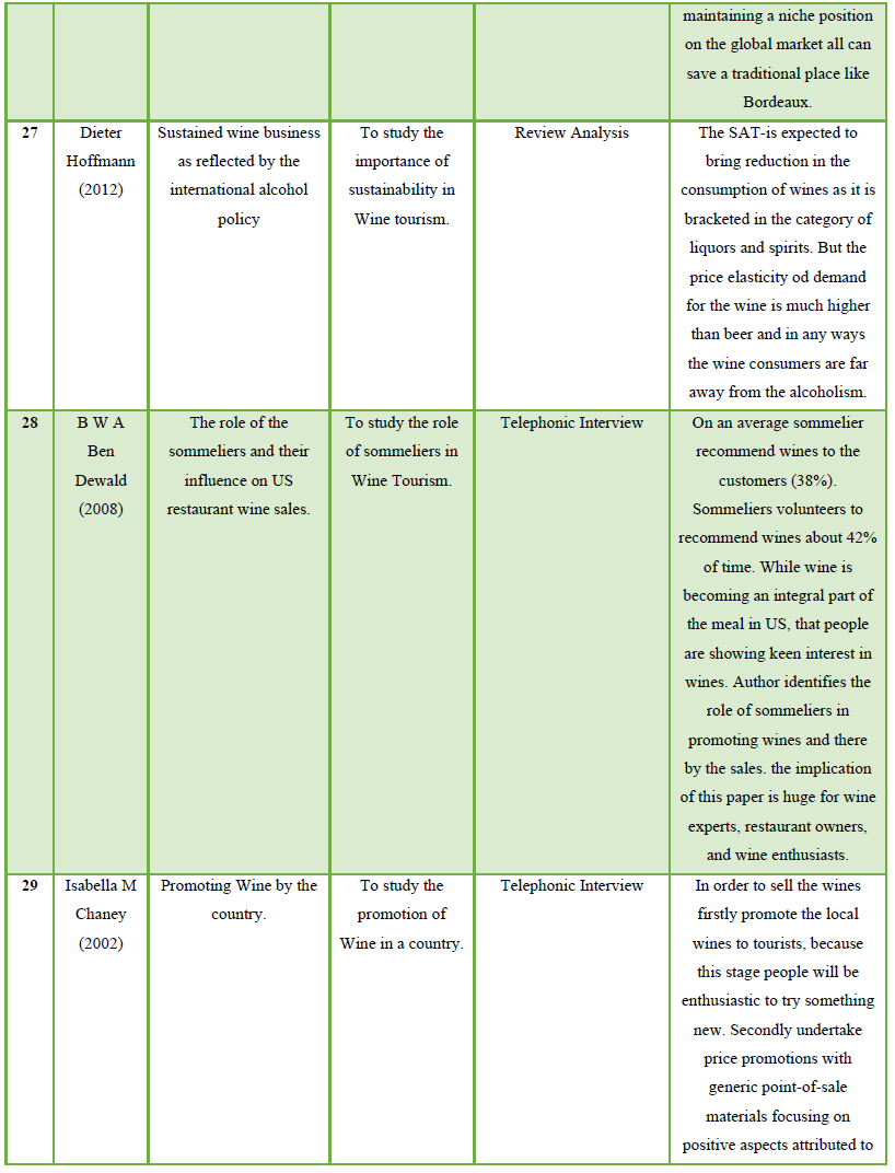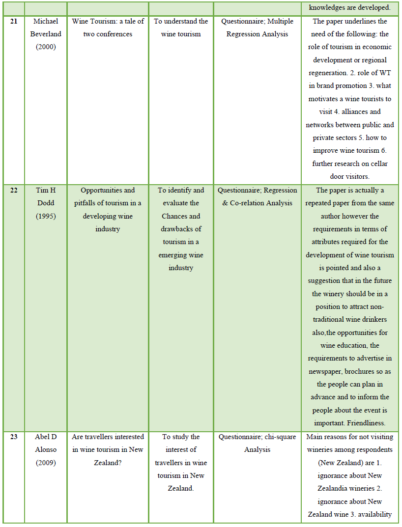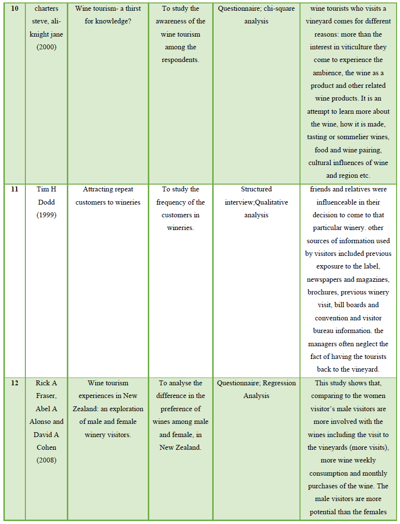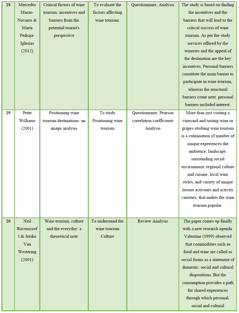 Due to restricted amount of research that has examined factors contributing to the promotion and welfare of Wine tourism in, published research in independent variables were also reviewed. The sample consisted of peer reviewed research articles published in hospitality, marketing, and tourism journals from 1986 – 2019. Published research articles were reviewed, of which 30 are referenced in the paper. From the point of literature review, a sample of 30 studies reporting on the examination of factors contributing to the promotion and welfare of Wine tourism in. The aim of the study, sample, methodology and key findings of these 30 studies has been summarized in table 1.