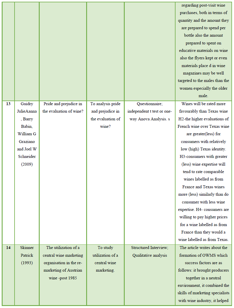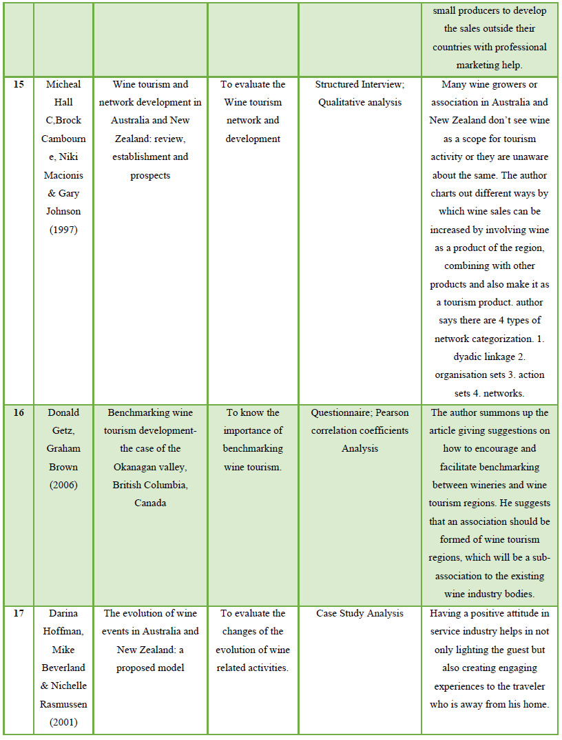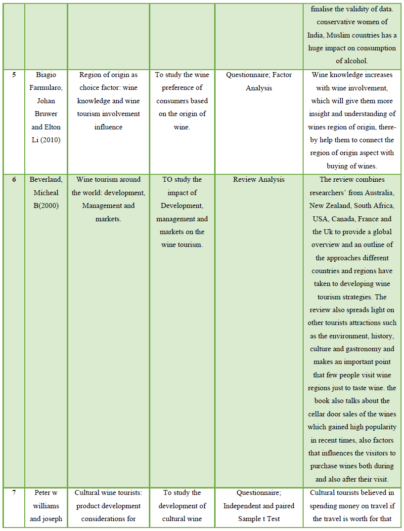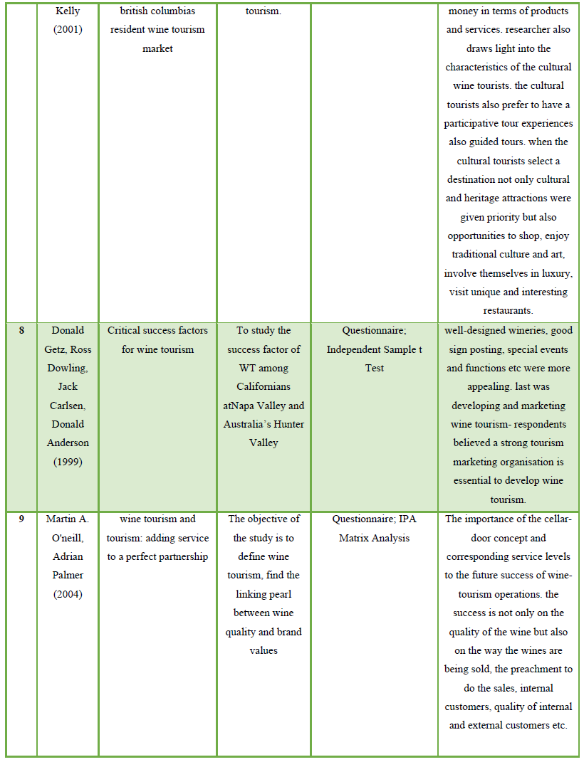 Due to restricted amount of research that has examined factors contributing to the promotion and welfare of Wine tourism in, published research in independent variables were also reviewed. The sample consisted of peer reviewed research articles published in hospitality, marketing, and tourism journals from 1986 – 2019. Published research articles were reviewed, of which 30 are referenced in the paper. From the point of literature review, a sample of 30 studies reporting on the examination of factors contributing to the promotion and welfare of Wine tourism in. The aim of the study, sample, methodology and key findings of these 30 studies has been summarized in table 1.