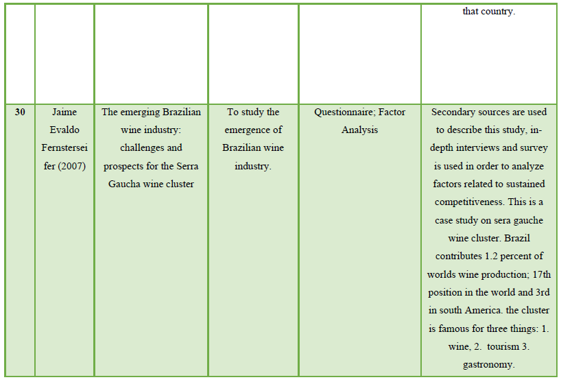 The article reviewed in the review of literature had several other factors like colors, package value, etc. But the research review was narrow down to the above mention four factors that were Benchmarking, Viticulture and Oenology, Special Interest Tourism (SIT) & Culinary Tourism and Global culture and Practices. Table 1 explain the entire review of literature of 30 articles that were published in reputed journals. The findings of this article are in line with the ongoing research attention of factors contributing to the promotion and welfare of Wine tourism.