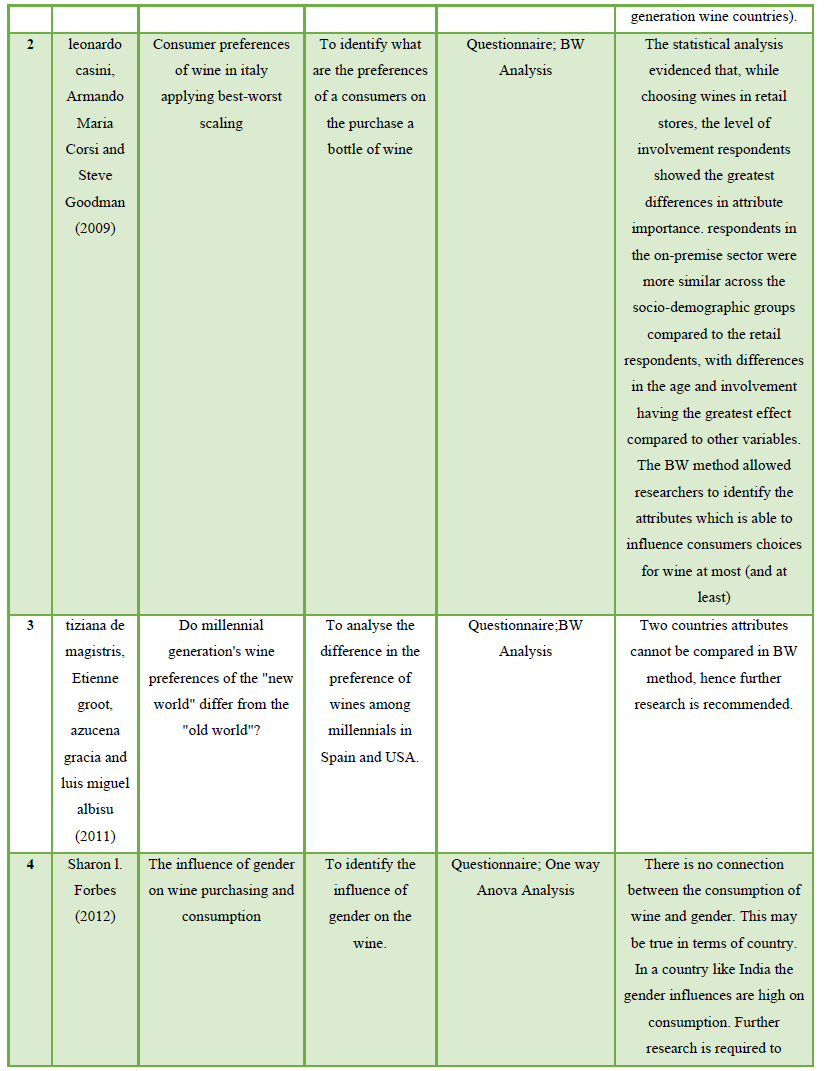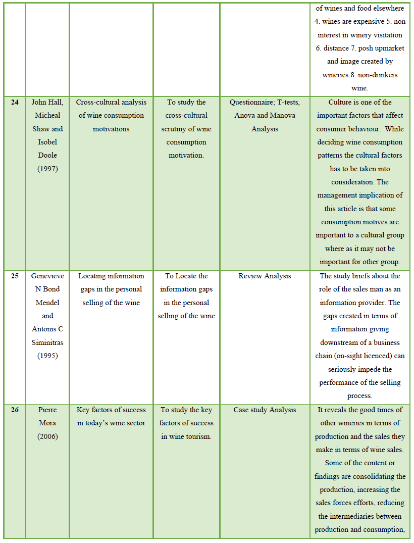 There are few limitations to this review of literature. The research was limited to peer-reviewed business, wine marketing, psychological, International Wine marketing, brand management and hospitality journals to find out the factors contributing to the promotion and welfare of Wine tourism. Research reports that would have met the inclusion criteria might have been available in other hospitality or non-hospitality publications.