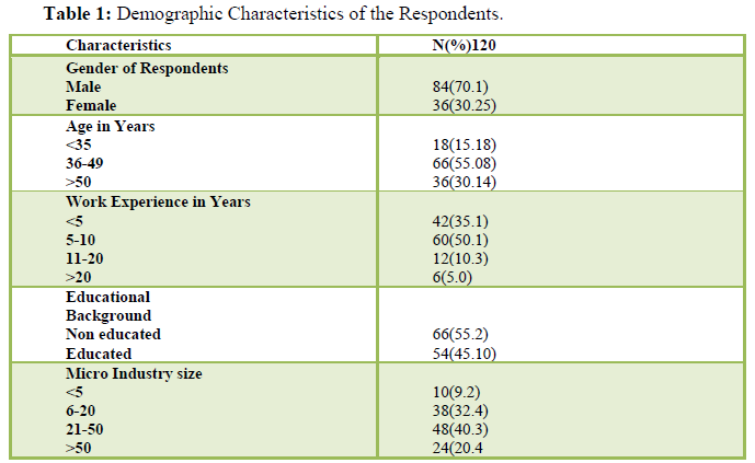 A reflected in Table 1 popular participants were male (70.1%) and (55.08%) aged between 36 and 49 years. Most (50.1%) of the respondents in the micro industries had at least ten years of work experience, while 55.2% had no formal education. Most businesses employ less than 9.2% of staff, while 40.3 % had employees in the range of 21-50 employees.
