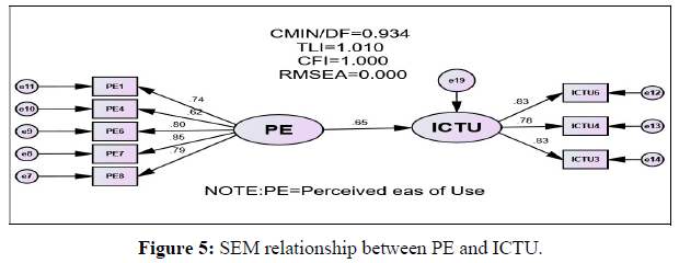 From the argument made above, there is a positive relation between perceived ease of use (PE) and ICT adoption, the SEM model in (Figure 5) indicates this relationship.