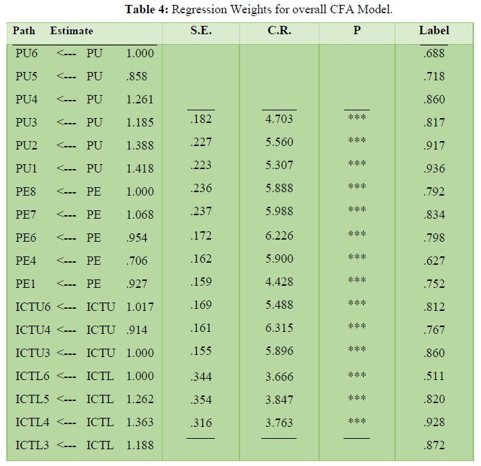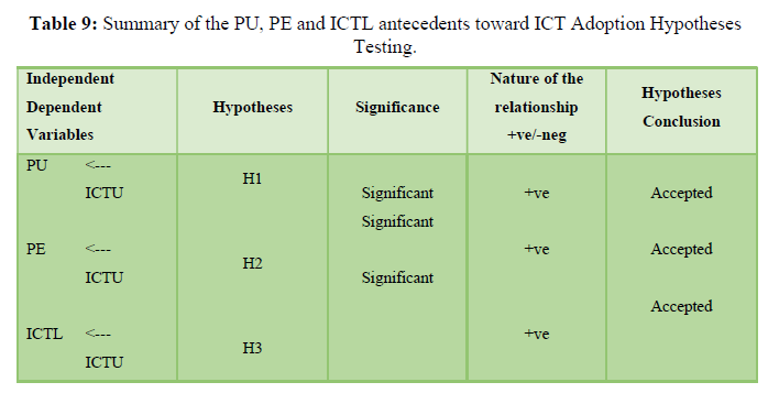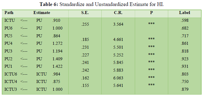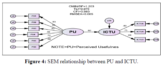 The hypothesized relationships as indicate above are examined against various coefficients and scores obtained from the analysis. In this study the hypotheses are tested based on the direction, the strength of the standardized paths coefficient (β), the critical ratio (C.R), and significance level (p-value). (Figure 4) depict the SEM relationship between PU and ICTU (ICTU).