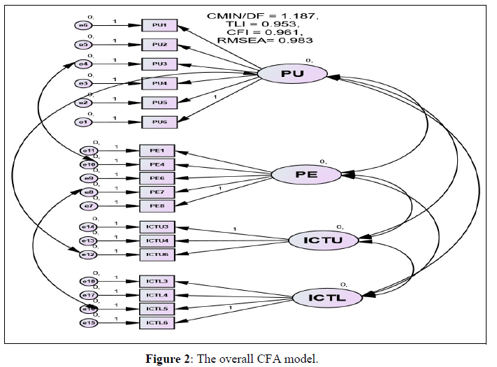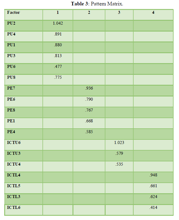 For this study, four factors were retained and contained at least loading factors Eigenvalues greater than 1. For example, factor 1 represent perceived usefulness (PU), factor 2 represent perceived ease of use (PE), factors 3 represent ICTL adoption/usage (ICTU), and factors 4 represent E-business/ICT literacy (ICTL). Details of factors and their underlying factor loadings are presented in the pattern matrix in (Table 3).