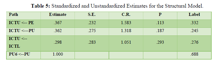 The structurural model was tested to the overal sample, following the acceptance of the overall measurment model with its fit indices and parameter estimates. Based on the conceptual framework of the study, the structural association encompaed the following; Perceived usefulness (PU) on ICT adaption; Perseives eas of use (PE) on ICT adoption and ICT literacy on ICT adaption(ICTL). After testing the model, the model produced the following fit indices as recommended from table 1 above; CMIN/DF = 1.290, TLI = 0.928, CFI = 0.936 and RMSEA= 0.078 as illustrated in (Figure 3) and (Table 5) which indicates the standardized and unstandardized value for the overall structural model.