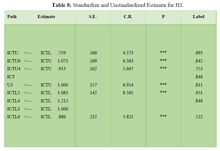 In order to determine the significance of the influence of ICT Literacy (ICTL) on ICT usage (ICTU) as illustrated in (Table 8). The path leading from ICTL to ICTU in Table 7 was used to examine the hypothesized relationship (H3) that there is a positive relationship between ICT Literacy (ICTL) and ICT Usage (ICTU). The test for this hypothesis showed that ICTL has positive and significance related to ICTU (γ = 0.365; C.R = 3.255; p = 0.001), meaning that when Zanzibar WHSs decision makers level of ICT literacy is perceived by 1 standard deviation, ICTU goes up by 0.365standard deviations. This implies that a higher level of ICT Literacy would result in a greater level of ICTU. Hence, the H3 of the study is supported (Table 9).