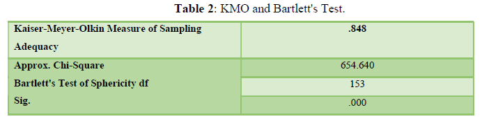 In this study the findings have met the above criteria as the KMO value was 0.848 while Bartlett’s Test of Sphericity was significant at p < 0.000. Bartlett’s Test of Sphericity tests the null hypothesis that the original correlation matrix is an identity matrix” (Field 2000: 457) it has to provide a chi-square output which must be significant. Hence suggesting that the sample size was adequate and that the data were appropriate for application of factor analysis as the structure was not an identity matrix, the sample also was adequte to run for CFA and SEM. These results are summarized in (Table 2).