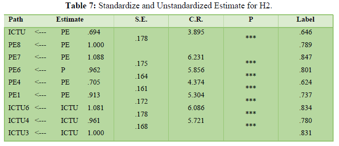 In order to determine the significance of the influence of perceived ease of use (PE) on ICT usage (ICTU) as illustrated in Table 6, the path leading from PE to ICTU in table 6 was used to examine the hypothesized relationship (H2) that there is a positive relationship between perceived ease of use (PE) and ICT Usage (ICTU). The test for this hypothesis showed that PE has positive and significance related to ICTU (γ = 0.266; C.R = 3.545; p = 0.000), meaning that when Zanzibar WHSs decision makers perceive ease of use by 1 standard deviation, ICTU goes up by 0.266 standard deviations. This implies that a higher level of PE would result in a greater level of ICTU. Hence, the H2 of the study is supported (Table 7).