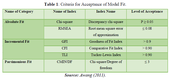 When using SEM, researchers frequently use multiple goodness of fit indices to judge the strength of the model and tell whether there is an acceptable fit between the observable data and the model. There are several criteria accepted, but this study used the one suggested by Iacobucci (2010) in which the Chi-square/Degree of freedom (CMIN/DF), Goodness of Fit Index (GFI), Tucker-Lewis Index (TLI), comparative fit index (CFI), and root mean square error of approximation (RMSEA) are used as criteria for determination of goodness of fit indices and the acceptable fit indices are depicted in (Table 1).