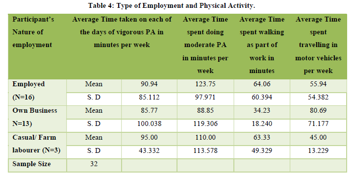 Results in Table 1 reveal that gender of participant did not greatly differ although there were more male participants 17(53.1%) than female 15(46.9%). Majority had university education 16(50%). Most of the participants were employed 16(50%). The results were used to establish relationships in job-related PA. The variations in gender are small and acceptable. However, the high population of participants having attained University education can also be associated with majority of them being in employment.