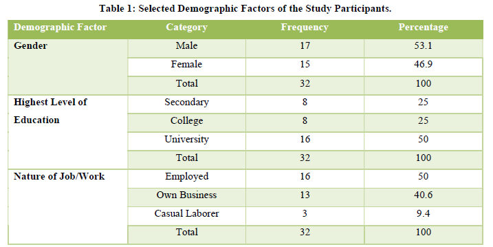 Using descriptive statistics, information on the selected demographic factors of the study participants was analyzed. The results are indicated in Table 1.