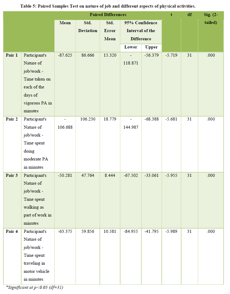 Paired sample t-test in Table 5 reveal statistical significance difference between nature of job and average time spent in various aspects of physical activity. Results indicate that the highest average time (106.688 min) was doing moderate physical activity with a statistical significance difference at t (31) = -5.681, p=0.000 followed by time (87.625 min) spent in vigorous physical activity with a statistical significance difference at t (31) = -5.719, p=0.000, average time spent (63.375 min travelling in motor vehicles with a statistical significance difference at t (31) = -5.989, p=0.000 and the lowest average time (50.281 min) spent in walking as part of work with a statistical significance difference at t (31) = -5.955, p=0.000. This implied that although all had significance differences the mean reveals that despite the nature of participants job moderate physical activity was evident.