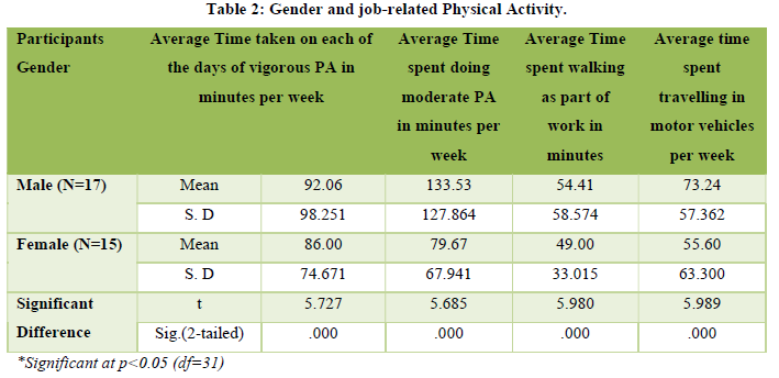 It was evident from the results that all study participants spent a considerable amount of time in job- related physical activity. Both genders attained the recommended 75 min of vigorous physical activity per week at 92.06 min among male and 86.00 min for female. The recommended time per week for moderate physical activity is 150 min and only male participants nearly achieved the parameter at 133.53 min. This in agreement with studies by (Michishita et al, 2017). (Puciato, 2019) showed that generally men spent more time in different forms of work-related physical activities. In addition, the findings showed a statistical significance difference between male and female t (31) =5.685; p=.000.