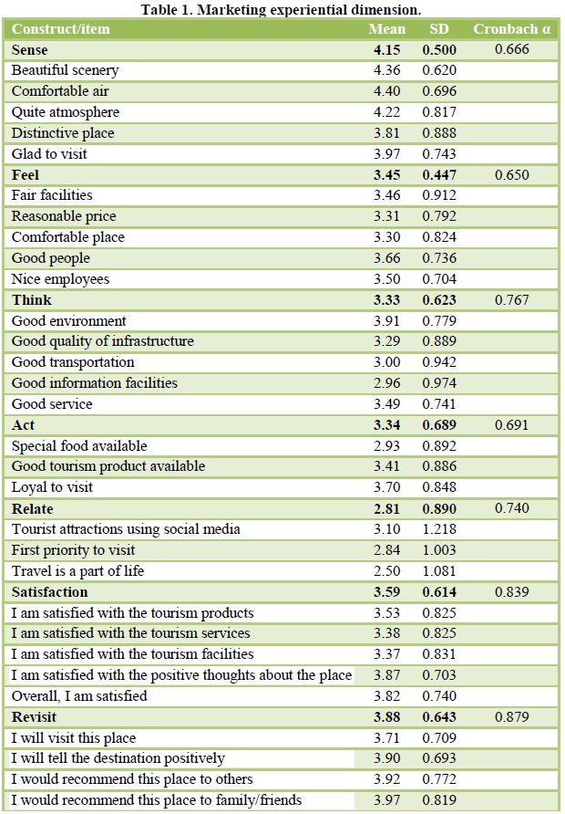 The results of this study indicate that each dimension of experiential marketing plays a significant role in both satisfaction and re-intention to visit. Act dimension has a dominant role, followed by the dimension of think and relate, while the role of sense and feel dimensions are minor. Furthermore, all dimensions of experiential marketing have impact to satisfaction and influence on re-visit intention. This analysis can provide a framework for destination marketing in order to create a proper promotion.