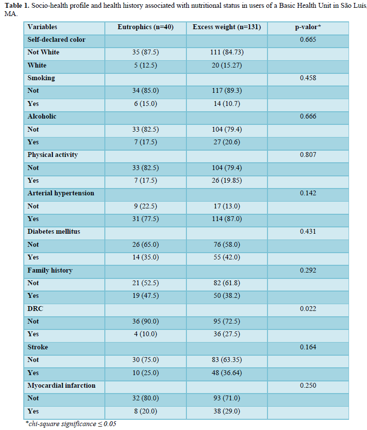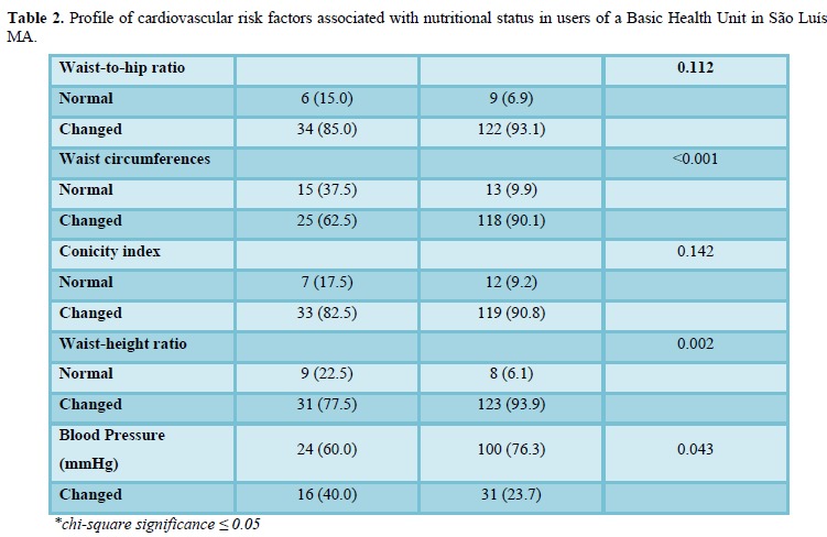 In this context, this study aimed to assess the association between cardiovascular risk factor sand nutritional status in Primary Care user sat a Health Unit in São Luís, MA.
