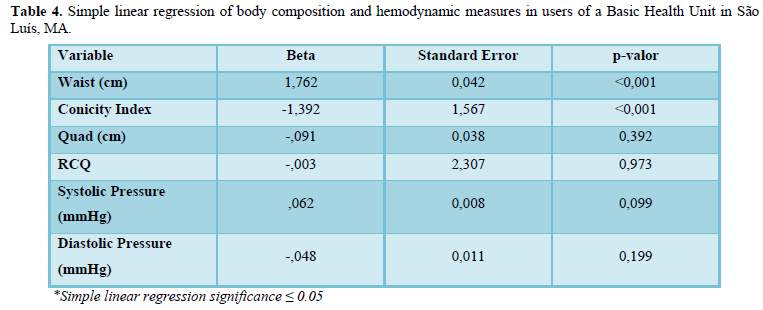 Analyzing the regression of the body and hemodynamic composition measurements, the data described the relationship statistical between the variable waist circumference (<0.001) and the conicity index (<0.001) which demonstrates higher in the degree of influence of these variables on the detection cardiovascular risk when compared to the other variables studied as shown in Table 4.