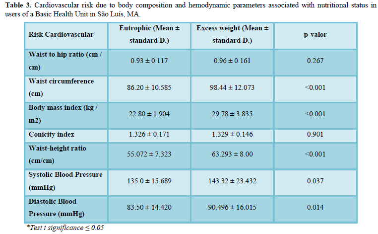 Results: The study showed a predominance of overweight people (n = 131) both sexes, self-declared color non-white (84.73%), non-smokers (89.3%) non-alcoholic (79.4%) prevalence. in both groups (eutrophic and overweight) sedentary people 82.5% and 79.4%, respectively. The evaluation of body composition and hemodynamic indicators showed alteration of all measurements in both groups. And the regression-adjusted analysis of body composition and hemodynamic measurements showed statistically significant results only for waist circumference (<0.001) and conicity index (<0.001).