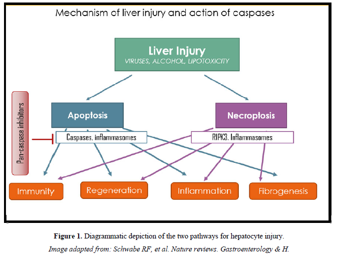 Beneficial effects of various caspase inhibitors have been shown in several models of liver diseases in recent times. Nivocasan (GS 9450) a caspase 1, -8, 9 inhibitor completed phase II study in NASH and IIatrial in chronic HCV, where it was shown to cause reduction in the liver of liver transaminases. However, concerns about adverse effects had halted further studies [23].