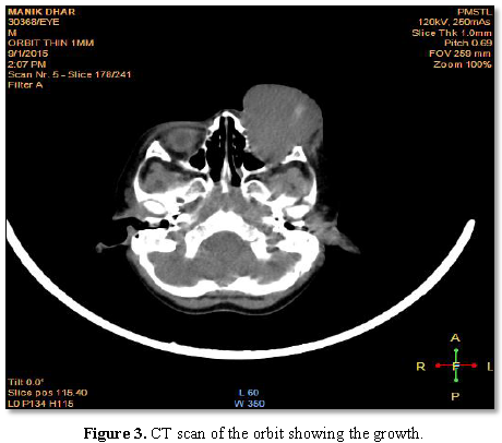 contrast enhanced CT scan on the orbit shows soft tissue mass lesion