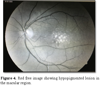 [3]. Fluorescein angiography (FA) shows a hypo fluorescent area corresponding