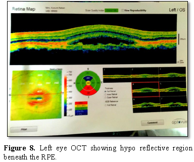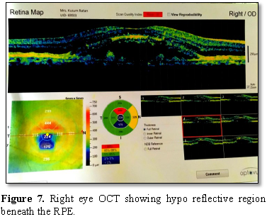 3-4 hypo fluorescent spots present inferiorly. The OCT showed hypo reflective