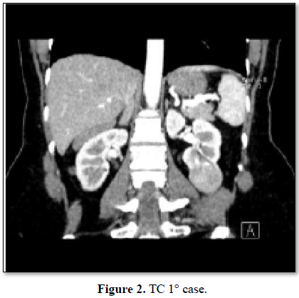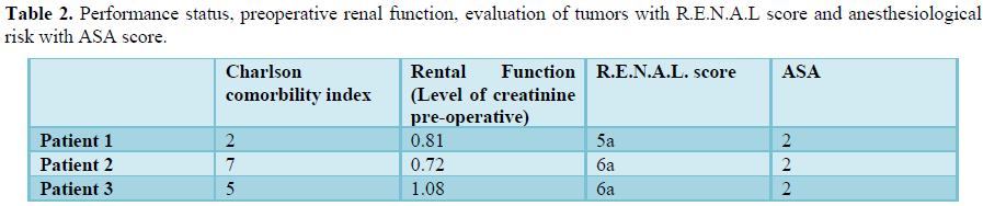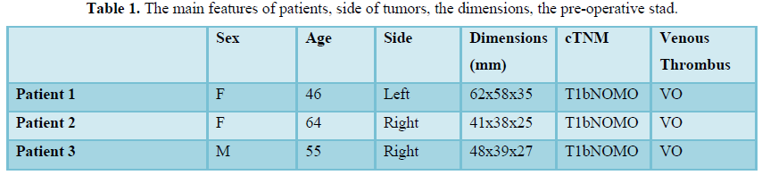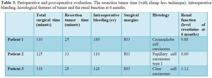 In all patients the total operative time and the resection time of the tumor time are reduced compared to median of our center. Intraoperative bleeding is minimal and it isn’t necessary to isolate the vascular pedicle. In all procedures the time of ischemia is 0. The post-operative course has been regular (Clavien 0 in every patient). The tumor of patient 1 is a chromophobe cell renal carcinoma, the tumor of patient 2 is a papillary renal cell carcinoma type 1, the tumor of patient 3 is a clear cell renal carcinoma. In all patients’ surgical margins are negative. The complete description of the pre-operative, intraoperative and post-operative features is showed in Tables 1-3 and Figures 1 and 2.