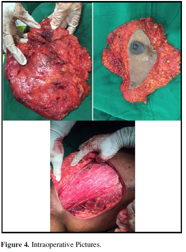 Complete bone scan was done which showed negative for metastasis. USG abdomen was normal. Patient was staged as III B (T4b N2 M0). Two cycles of neoadjuvant chemotherapy were given following which there was decrease in the size of the lymph node and it became mobile. Patient was taken up for Modified radical mastectomy.
