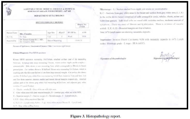 Histopathology report showed invasive ductal Carcinoma breast of right side with metastatic deposits in lymph nodes [stage III A(AJCC)]. ER, PR statuscamepositive, HER2 was negative. Post operatively patient was continued with 4 cycles of adjuvant chemotherapy. Patient was started on tamoxifen and regular follow up is being done (Figure 3).
