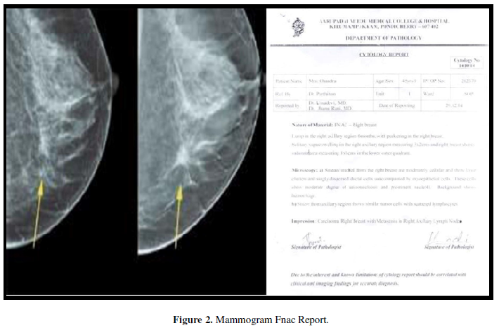 45 years old female presented to OPD with complaints of burning sensation in the right-side axilla for 6 months. History of dimpling of the skin over right breast was given, along with history of pain present over the site of dimpling. There was no h/o of any lump in breast/nipple discharge. On local examination of right breast, dimpling in lower outer quadrant of breast was identified. Another dimpling was seen over right axilla beneath which there was a 1.5X 1.5 cm hard fixed solitary lymph node in right axilla. FNAC of lymph node revealed carcinoma of right breast with metastasis in right axillary lymph node. Mammogram showed a well-defined hypoechoic micro calcification lesion measuring 0.8x0.7 cm noted below right nipple suggesting of a possible mass lesion with axillary lymphadenopathy (Figures 1 and 2).