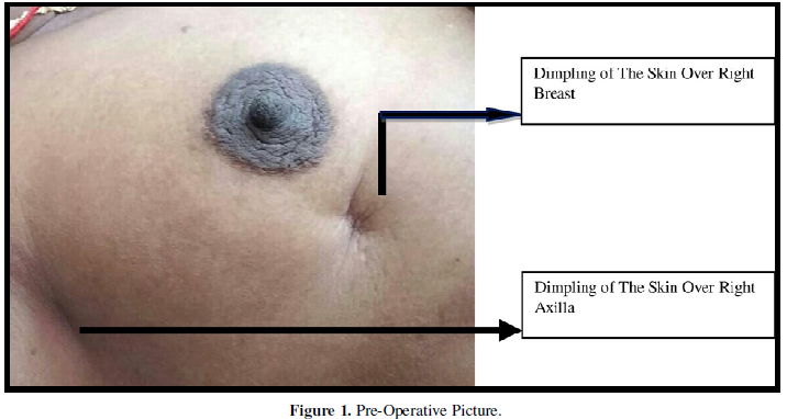 Breast cancer is a global burden. According to World Health Organization, breast cancer is the most common cancer among women worldwide, claiming the lives of hundreds of thousands of women each year and affecting countries at all levels of modernization. It accounts for 18% of malignancy worldwide. This paper presents a rare case of breast carcinoma that presented with only dimpling of skin and no lump. The workup, diagnosis of the patient along with appropriate surgery and chemotherapy is described.