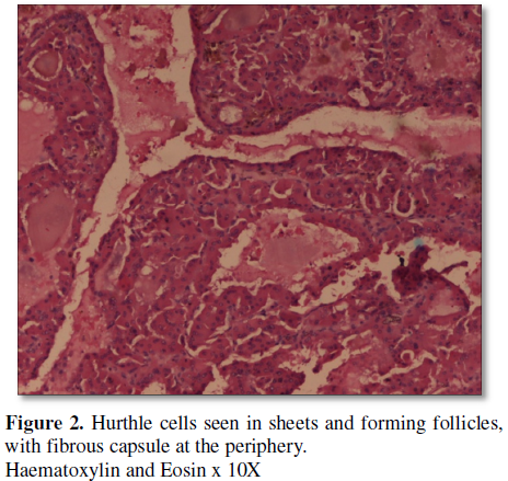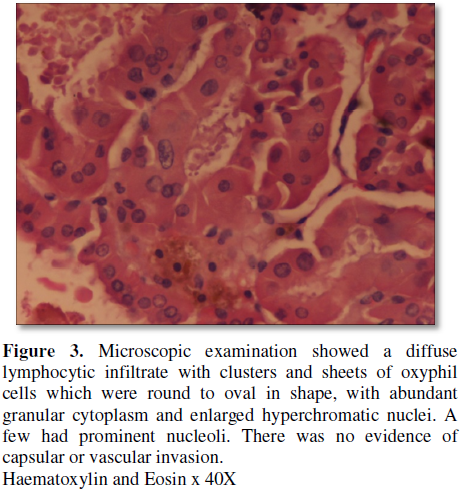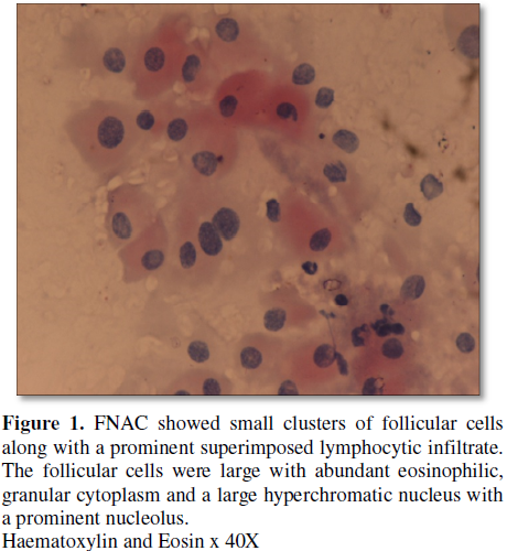 Fine needle aspiration cytology (FNAC) revealed a scant material comprising of thick colloid and small clusters of follicular cells along with a prominent superimposed lymphocytic infiltrate. The follicular cells cytologically were large with abundant eosinophilic, granular cytoplasm and a large hyper chromatic nucleus with a prominent nucleolus (Figure 1). Antibodies to thyroid peroxidase were found to be raised (472 IU/L). Flow cytometric analysis performed was inconclusive. In light of the above observations, a provisional diagnosis of Hashimoto’s thyroiditis with the possibility of a Hurthle cell neoplasm was made.