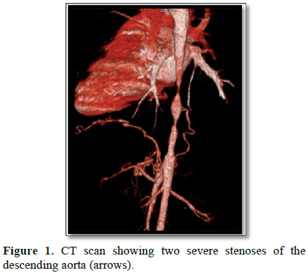 Takayasu’s arteritis was first described in 1908 by Mikito Takayasu in Japan [1]. It is a chronic nonspecific inflammatory vasculitis of unknow etiology that mainly affects the aorta and its main branches. The inflammatory process results in structural changes that lead to vascular wall fibrosis and stenosis[2,3]. Stenosisis the most common vascular lesion [3,4], but aortic aneurysms are also described in the literature. Stenotic involvement of the descending aorta is very uncommon, and the clinical expression may mimic an aortic coarctation.