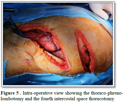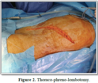 The surgery was performed under general anesthesia and thoraco-phreno-lombotomy, without extra corporeal circulation.