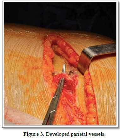 The surgical procedure was performed under general anesthesia and without extra corporeal circulation. We decided to perform a thoraco-phreno-lombotomy (Figure 2) in order to access the thoraco-abdominal portion of the aorta. From the cutaneous incision, there was a very developed parietal collateral circulation (Figure 3).