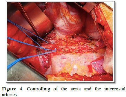 After controlling the thoraco-abdominal aorta and the intercostal arteries just above the coeliac trunk, we were not able to control the upper neck so we performed a second thoracotomy in the 4th intercostal space.