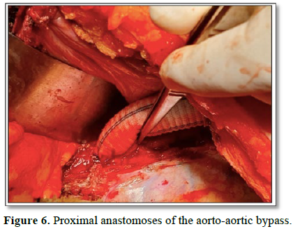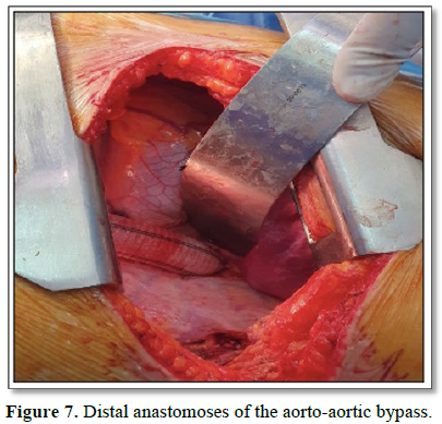 After controlling the thoraco-abdominal aorta and the intercostal arteries just above the coeliac trunk (Figure 4), we were not able to control the upper neck. So, we performed a second thoracotomy through the 4th intercostal space (Figure 5). We administrated a 1mg/kg bolus of heparin, andvia lateral clamping of the aorta, we performed an aorto-aortic bypass with a 20 mm tubular Dacron graft (Figures 6 and 7). No complications were noted after the surgery, and we noted the reappearance of lower limb pulses.