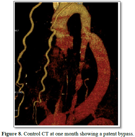 The lower limb claudication also disappeared. The CT Scan control showed a perfectly patent bypass (Figure 8).