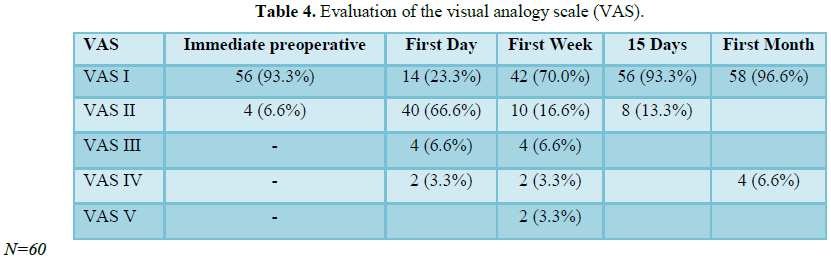 (93.3%) were VAS I and a month were 58 (96.6%). The incorporation to the usual