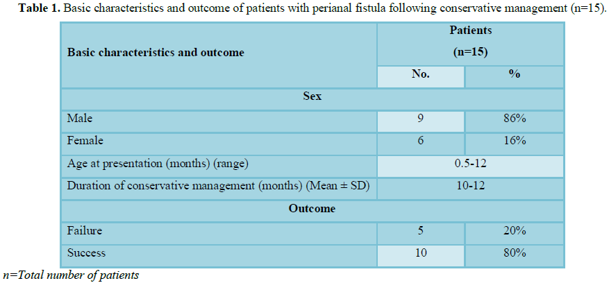 In 10 (65.7%) infants, anal fistula closed