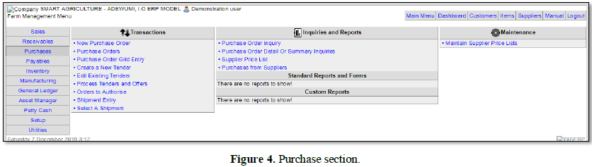 The purchases section consists of the new order, purchase orders, purchase order entry, create a new tender, edit existing tenders, process tenders and offers, order to authorize, shipment entry and select a shipment [9].