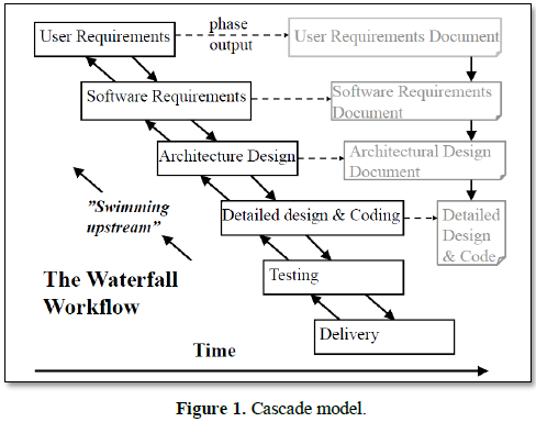 The cascade model which is popularly known as the waterfall model was adopted to develop this software. Therefore, a consecutive structure, process, regularly utilized in programming advancement forms, in which progress is viewed as streaming relentlessly downwards (like a cascade) through the periods of origination, commencement, examination, plan, execution, testing and upkeep was used. In this model, each stage was finished completely before the following stage can start (Figure 1). Towards the end of each stage, an audit happens to decide whether the undertaking is on the correct way and whether to proceed or dispose of the venture.
