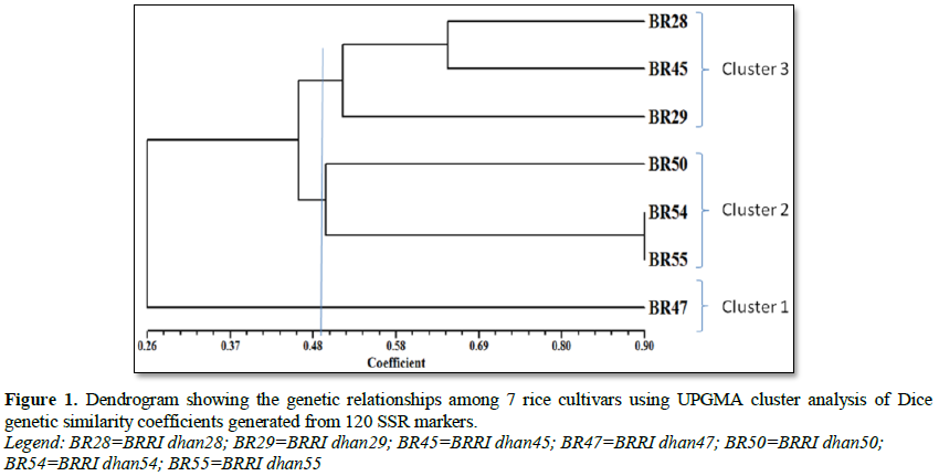 The dendrogram based on Dice similarity index and UPGMA method (Figure 1) was obtained from the binary data that was deduced from the DNA profiles of the samples analyzed. Three distinct clusters were created from the analysis of the pooled SSR marker data at the similarity coefficient of 0.49. The cluster analysis showed high genetic variation among the rice cultivars studied, with similarity coefficient value ranging from 0.26 to 0.90. Cluster 1, Cluster 2 and Cluster 3 comprised one, three and three cultivars, respectively. Cluster 1 included only BRRI dhan47. While the second cluster was divided into two sub-clusters; the first one comprised two cultivars (BRRI dhan54 and BRRI dhan55) and the second sub-cluster included only BRRI dhan50. Cluster 3 was also divided into two sub-clusters; BRRI dhan29 alone grouped in a sub-cluster and remaining two cultivars (BRRI dhan28 and BRRI dhan45) had been grouped in another sub-cluster.