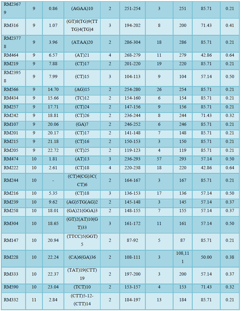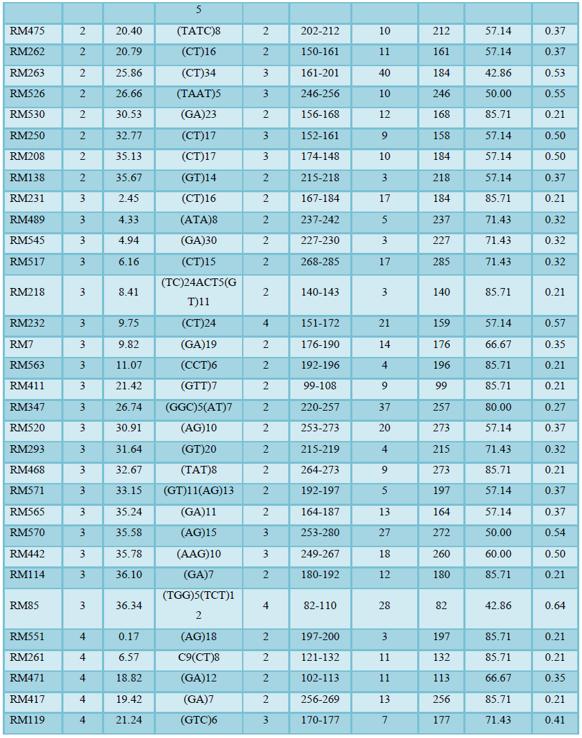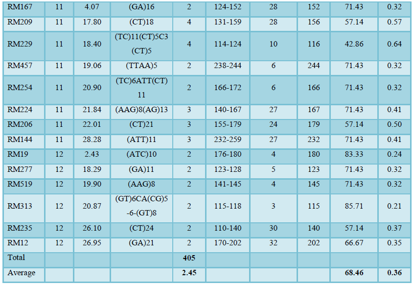 The molecular weights for each band were measured in base pairs using Alpha Ease FC 5.0 software (Alpha Innotech Corporation). 165 polymorphic SSR markers (Table 2) distributed across 12 chromosomes were used for diversity analysis. Data of non-amplified and monomorphic SSR markers were not used for diversity study. Summary statistics, including the number of alleles per locus, major allele frequency and Polymorphic information content (PIC) values were determined using Power Marker version 3.25 [22]. PIC values were calculated for each of the SSR loci with the following formula proposed by Anderson et al. [23].